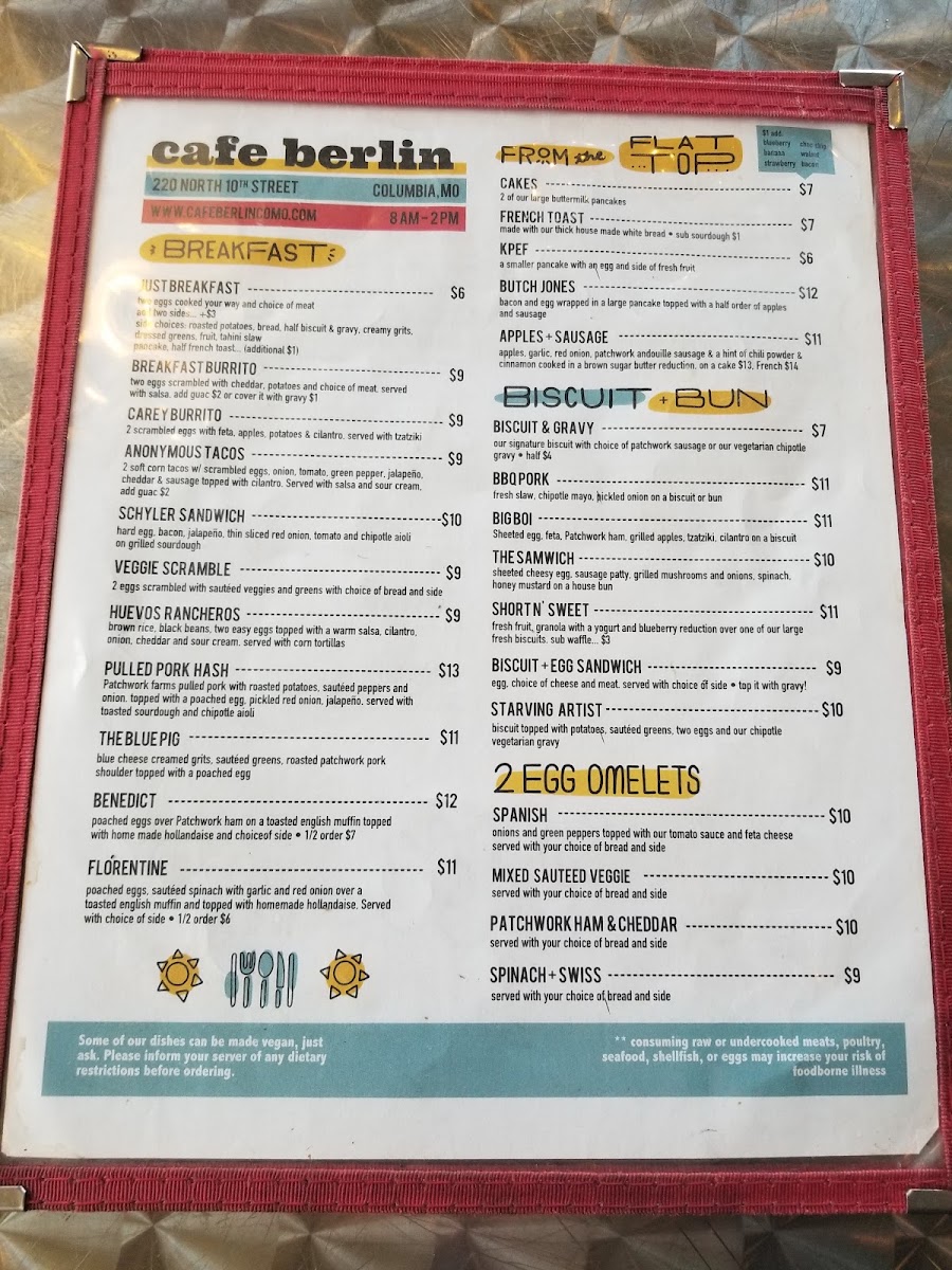 Welcome to Cafe Berlin Columbia, a vibrant breakfast haven nestled at 220 N 10th St, Columbia, MO. As you step inside, you're greeted by an eclectic decor and an inviting atmosphere that feels like home. This local gem shines with its diverse menu, offering everything from indulgent French toast to Mediterranean delights. Customers rave about the perfectly cooked eggs, crispy biscuits, and flavorful dishes like the Carey Burrito and astounding Awesome Burger.